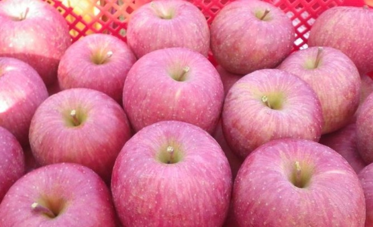 ふじは、言わずと知れたりんごの王様。甘味と酸味のバランスがよく、海外でも生産されるほど世界的にも人気の高いりんごです。りんごは果実に袋をかけて栽培するのが一般的でしたが、袋をかけずに(無袋栽培)太陽の光をたくさん浴びて育ったものが「サンふじ」です。無袋栽培は、袋をかける栽培よりも糖度や香りが高くなるといわれています。また、当園のある朝日町は寒暖の差が激しく、蜜が入りやすいのが特徴です。